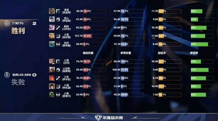 直播吧10月21日讯2025KPL年度总决赛败者组本场比赛是由杭州LGD.NBW对阵到广州TTG,败者离场谁能从败者组杀出重围让我们一起期待!第一局:LGD前期拿到优势但是被TTG凭借单带打平,中期TTG打赢团战拿下暴君后利用蚩奼的发挥成功拿下首局!第二局:TTG前期凭借后羿大招强开配合关羽进场成功压制LGD,中期TTG团灭LGD后拿下主宰,TTG后期打出0换3后带着龙兵拿下胜利!第三局:TTG前期抓到节奏入侵野区压制LGD发育,LGD被TTG经济碾压后TTG轻松拿下赛点!第四局:TTG多次入侵野区压制LGD,LGD后期团战无法处理狂铁被TTG带着兵线一波拿下胜利!
